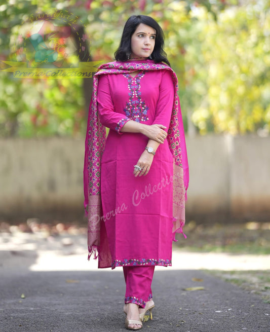 Pink Cotton printed kurta pant and mulmul dupatta set embroidery work on the neck