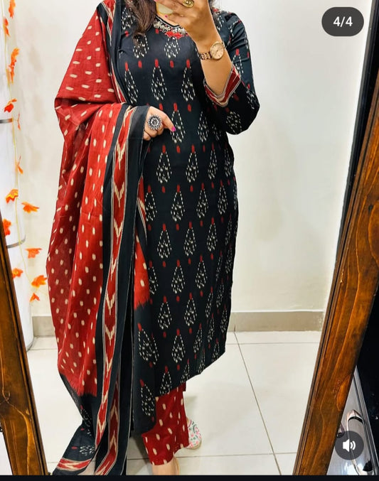 Black Cotton printed kurta pant and mulmul dupatta set embroidery work on the neck